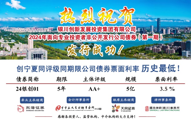 銀川創(chuàng)投集團(tuán)2024年第一期公司債券成功發(fā)行 ——?jiǎng)?chuàng)寧夏同評(píng)級(jí)同期限公司債券票面利率歷史最低